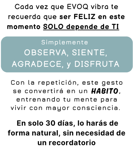 Desde el primer momento, desde la primera vibración, EVOQ te invita a salir del piloto automático y a reconectar con el presente. Notarás cómo, de forma natural, comienzas a prestar más atención a los pequeños detalles de la vida, a sonreír más y a agradecer lo que te rodea.